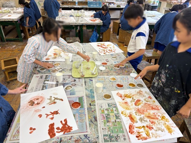 4年生の図工「どろとろとろ絵の具をつくって指でえがこう」の様子です。