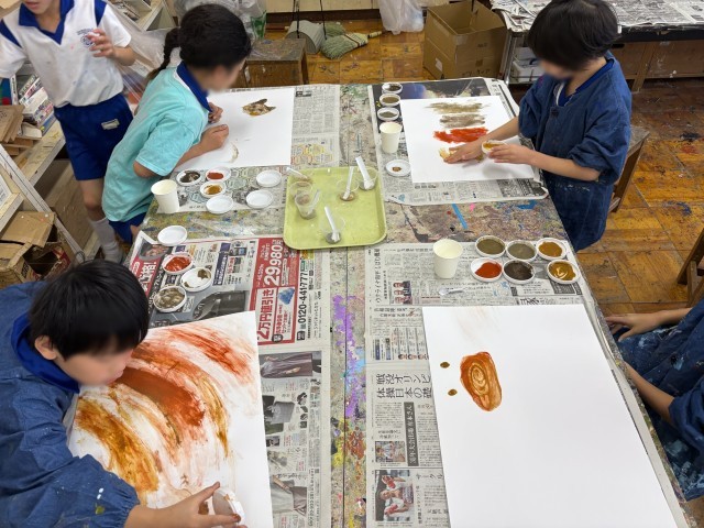 日本各地の粘土の粉末を、洗濯糊で溶き、自分の好きな濃さの絵の具をつくりました。