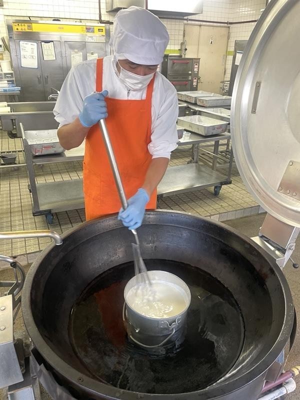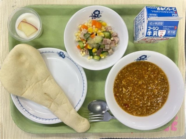 今日はキーマカレーです。キーマカレーは、ひき肉と細かく刻んだ野菜をスパイスで煮こんだ料理です。ひき肉にはたんぱく質や鉄分が多く含まれ、成長期であるみなさんの体づくりに役立ちます。野菜はにんじん、たまねぎ、セロリなどを使い、ビタミンや食物せんいをしっかりとれるようにしました。スパイスの香りで食欲が増し、苦手な野菜も食べやすくなります。ナンとの組み合わせでエネルギーもしっかりとれ、寒くなる季節にぴったりの温かいメニューです。