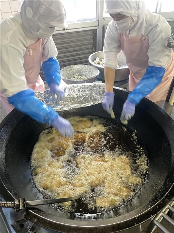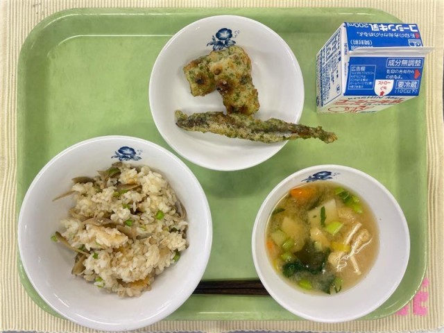 今日きょう献立こんだてには、ししゃもとちくわのいそべあげをだしました。ししゃもはほねまで食べられるた    さかななので、みなさんのほね丈夫じょうぶにするカルシウムが豊富ほうふです。ちくわはお魚   さかなからできていて、からだ作るつく  たんぱくしつ摂ると ことができます。いそべあげは海苔のりにビタミンやミネラルが含まれふく    からだ調子ちょうし整えるととの    のに役立やくだちます。揚げ物あ  ものなので食べすぎた   には注意ちゅういしながら、ほねからだ元気げんきにしていきましょう。
