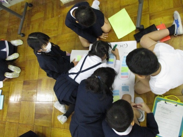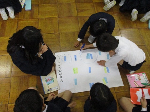 国語科「そうだんにのってください」の学習では、生活科「町探検」と関連付けて学習しました。店や人について相手に何をどのように伝えたらよいか付箋を貼っていきながら話し合いを進めることができました。