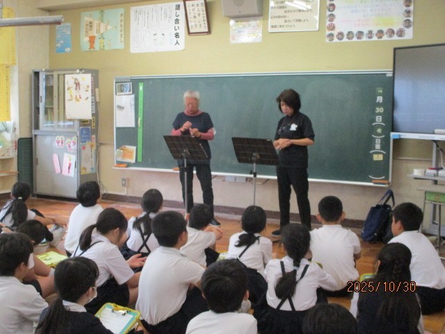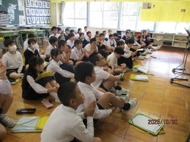 10月30日に、台東区手話サークルの方に来ていただき、手話ボランティアのお話を聞きました。手話通訳をするときに大変なことなどを手話をしながらお話をしてくださいました。最後には、名字の手話も教えていただき、自分の名前を指文字だけでなく自己紹介できるようになりました。