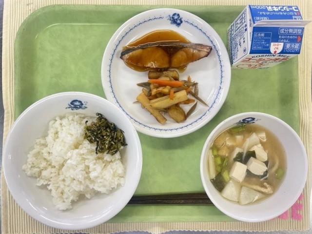 今日の給食に出ている魚は”ぶり”です。この魚は、成長する段階で名前が≪わかし→いなだ→わらさ→ぶり≫と4回変わることから、”出世魚“といわれています。また、頭の働きをよくする良質なあぶらがたくさん含まれているので、残さず食べてくださいね。実際のぶりの大きさがわかる写真が2年生教室前の廊下にかざってあるので、確認してみましょう。 また、骨があるので、気を付けてたべましょう。