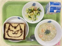 今日は、「学芸会応援献立」で、4,5年生の作品をイメージしています。4年生の劇「なんでも引き受け株式会社」にちなんで、「50ポイントサラダ」を用意しました。4年生の劇は“ポイント”がキーワードで、どんな意味を持つのかは、当日のお楽しみです。5年生の劇「マジョリン」に合わせたデザートは、リンゴを使った「まじょリンゴゼリー」。マジョリンが人間に悪いことをするために向かった村で行われていた「りんご祭り」より、給食に入れてみました。その後のマジョリンは・・・?とても気になりますね。発表当日を楽しみにまちましょう。