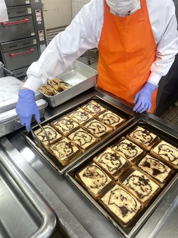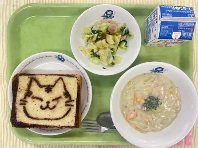 今日は、学芸会をがんばる3・6年生を応援する「学芸会応援献立」です。3年生の劇「キャッツ」にちなんだ「ねこのシュガートースト」は、カリッと甘く、かわいいねこを表現しました。6年生の劇「人間になりたかった猫」からは「ジリアンのホワイトシチュー」。温かく少し特別な味わいに、劇に出てくる登場人物のまっすぐな気持ちや優しさをイメージして作りました。給食を通して、子どもたちの表現する楽しさと本番への意欲を応援しています。
