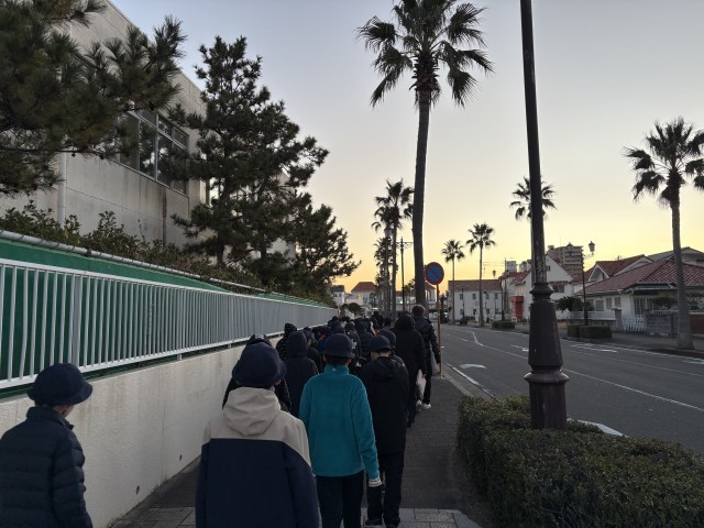 宿舎には昨晩の北海道、青森地震の影響はありませんでしたが、今朝の朝会は北条海岸の予定を変更して駐車場で行いました。