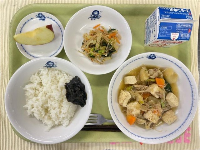 今日の給食のおかずは「すきやき風の煮物」です。「すきやき」はもともと農具の「すき」で、肉を焼いたことからついた名前で、関西の料理で、関東では「牛鍋」と言われ、「しょうゆ、さとう、酒、みりん」で作った「わりした」で、牛肉、長ネギ、しらたき、焼き豆腐などの具をいっしょに煮て作りました。今日の給食では、その野菜の他に、にんじんやこまつななど、たくさん入れたので、好き嫌いせずに食べましょう。