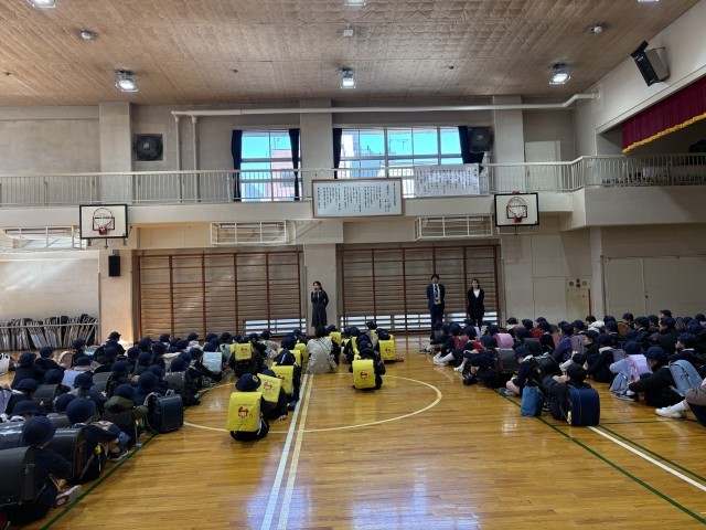 今回は、本番と同じように体育室に全校で集まり、そこからコースごとに下校しました。