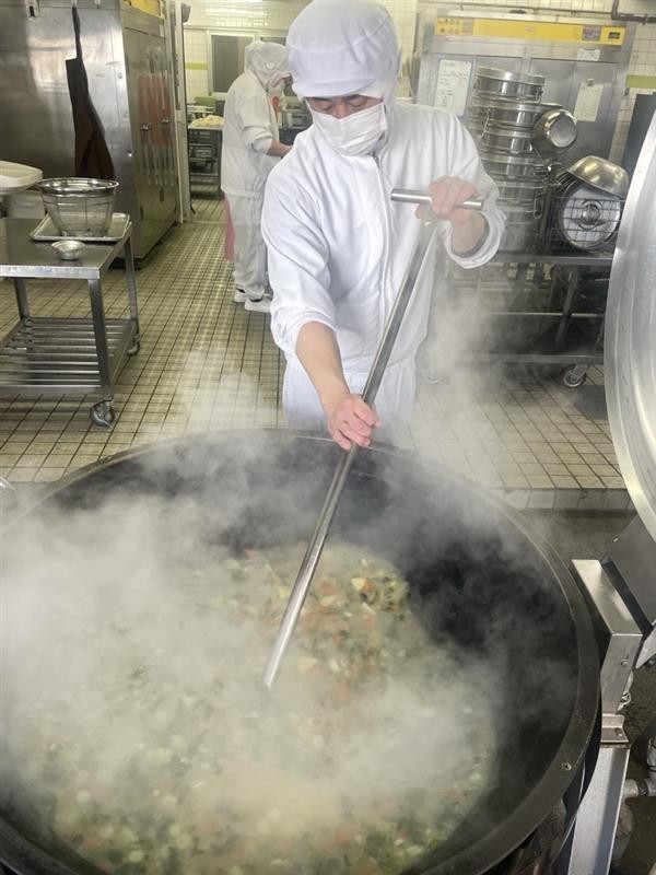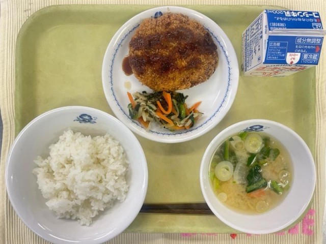 今日きょうのおかずは「キャベツメンチカツ」です。ひきにくキャベツ・タマネギのみじんり・パン・たまごしおこしょうを、ハンバーグのようによくこねてまるめ、小麦粉こむぎこ・たまご・パンをつけてげました。野菜やさいたっぷりのヘルシーなメンチです。キャベツメンチカツには、からだをつくるたんぱくしつや、おなかの調子ちょうしをよくする食物しょくもつせんいが入ってはい   います。野菜やさいお肉  にく一緒いっしょにとれて、元気げんき遊びあそび、しっかり勉強べんきょうするちからをくれるおかずです。よくかんで食べましょうた