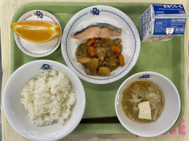 1月  がつ24日   にちから1月  がつ30日   にち全国ぜんこく学校がっこう給食きゅうしょく週間しゅうかんという日本にほん学校がっこう給食きゅうしょく歴史れきしったり、かえったりする期間きかんです。今日きょう給食きゅうしょくはじまった明治めいじ22年   ねん給食きゅうしょく再開さいかいされた大正たいしょう12年    ねん給食きゅうしょく紹介しょうかいします。給食きゅうしょく牛乳ぎゅうにゅう、そぼろ味噌汁みそしる、デコポンをかくしてみると、当時とうじ給食きゅうしょく再現さいげんされます。様子ようすかりましたか?当時とうじ戦争せんそう終わったお   ばかりで食べるた  ものがなく、そのころの小学しょうがく6年生ねんせいは、4年生ねんせいからだ大きさおお   しかない状態じょうたいでした。