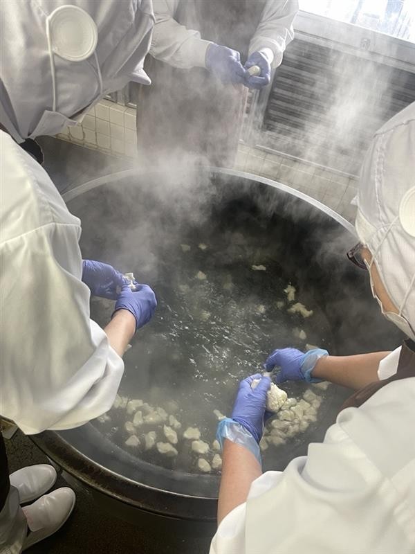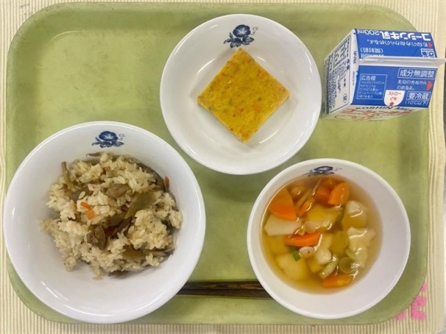 今日は大正12年ごろの給食に出ていた料理を取り入れています。そのころの日本は、関東大震災がおこり、栄養不足の子どもが増えました。それを改善するために学校給食が日本中に広がっていきました。この時代は、肉や魚などのおかずが少ない変わりに、ごはんや小麦などが多く使われていました。