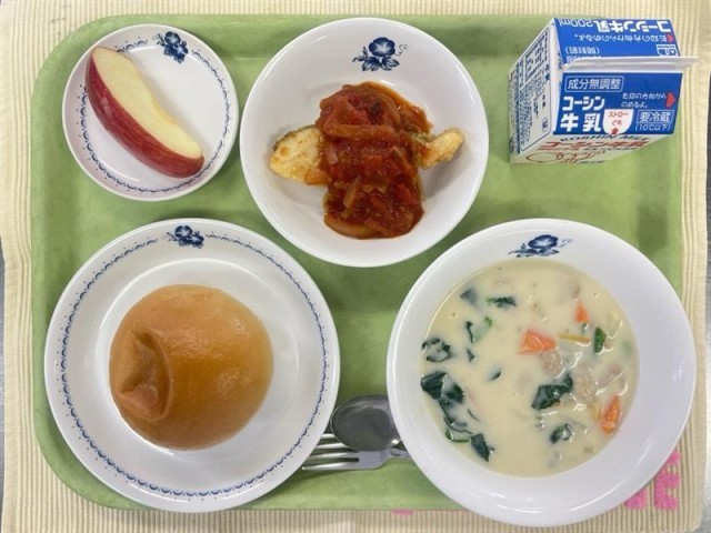 今日の給食にでている“たらのトマトソース”は、今が旬のたらというお魚に、トマトソースをかけた料理です。このソースは1時間以上煮込んでいて、こうすることで酸味をやわらげ、甘みを引き出すことができます。たらのたんぱく質とトマトのビタミンCで、元気に過ごす力がつきます。じゃがいものクリームスープは、じゃがいもでビタミンCや食物繊維、牛乳でカルシウムを補えます。今日も調理員さんがこころをこめて作ってくれました。感謝して食べましょう。