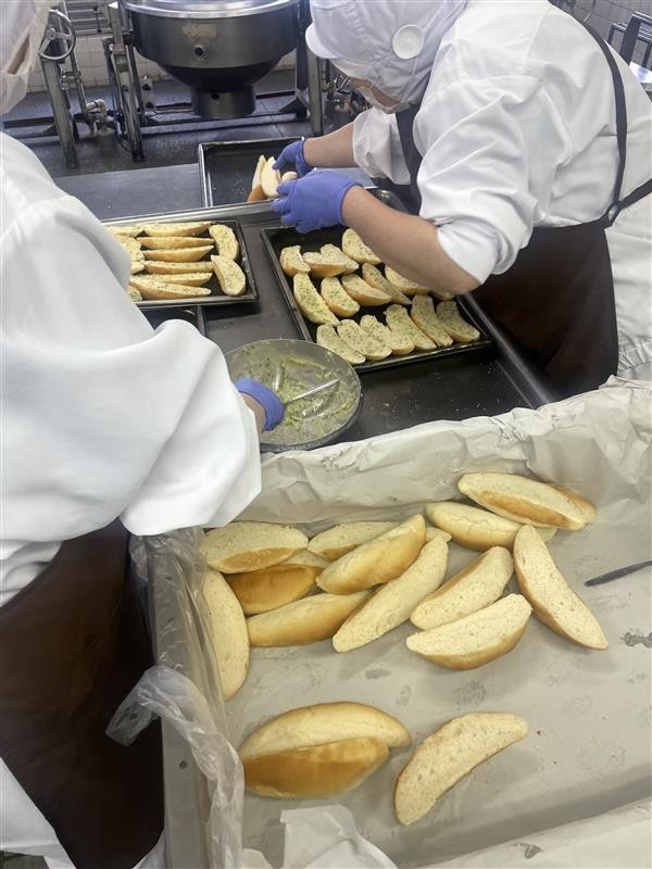2色フランスは、2つの味を楽しめるパンです。片方は、ガーリック味です。バター、ニンニクのすりおろし、パセリのみじん切りを混ぜたガーリックバターが塗ってあります。もう片方は、シナモン味です。バター、シナモン、グラニュー糖を混ぜて塗っています。ガーリックとシナモンは、それぞれ香りがありますね。よくかんで、2つの味と香りを味わって食べましょう。