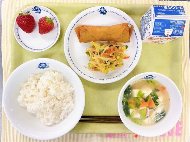 今日は、いちごが1人2つずつあります。一つは「とちおとめ」、もうひとつは「あまりん」という名前のいちごです。「あまりん」は全国いちご選手権で金賞をとった、とてもおいしい立派ないちごです。給食にはなかなか出せない貴重なものですが、農家さんが「子どもたちにおいしいいちごを食べてほしい」と大切に育て、八百屋さんも「できるだけ新鮮なまま届けたい」と協力してくださったので、今日の給食に出すことができました。たくさんの人のやさしい気持ちがつながって、みなさんのもとに届いています。味わって、感謝の気持ちもいっしょにいただきましょう。