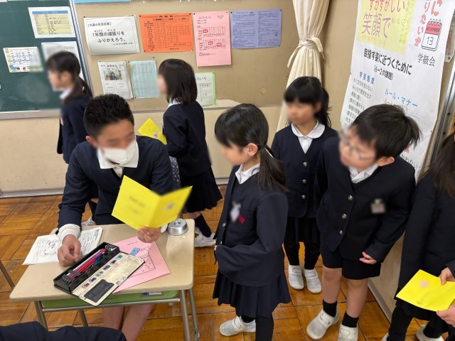 1年生がお世話になった6年生に、似顔絵とお手紙をプレゼントしていました。