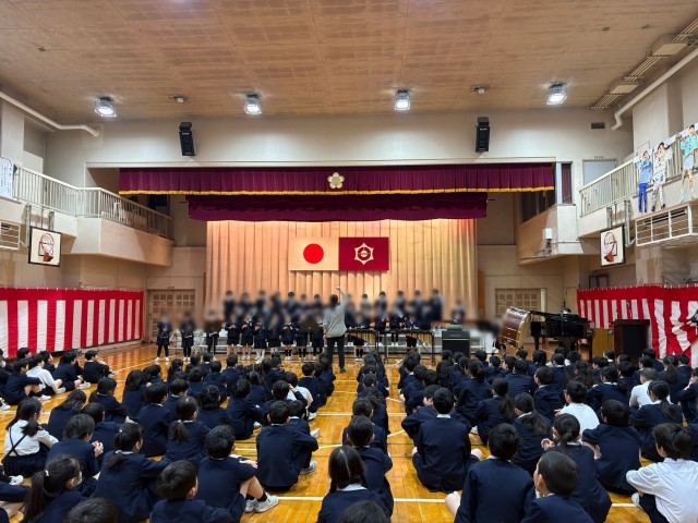 全校児童が静かに聴く中、たくさん練習をしてきた「よろこびの歌」の合奏を披露してくれました。
