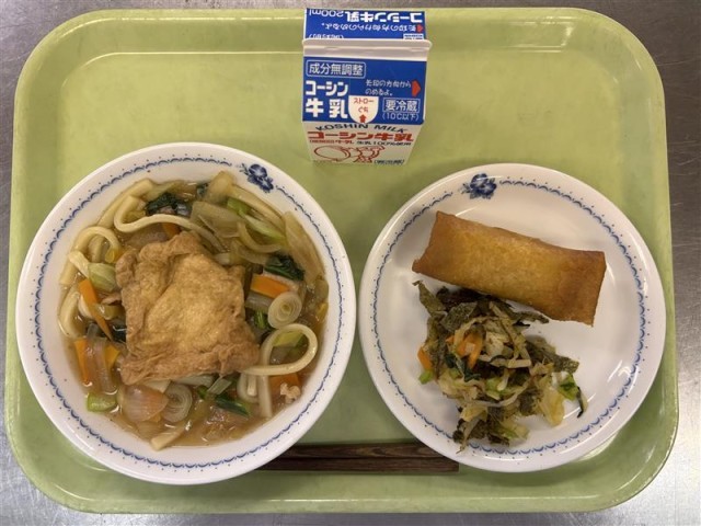 今日は、大きな油揚げがのったきつねうどんです!きつねうどんという名前は、油揚げがきつねの好物であるという言い伝えに由来するそうです🦊