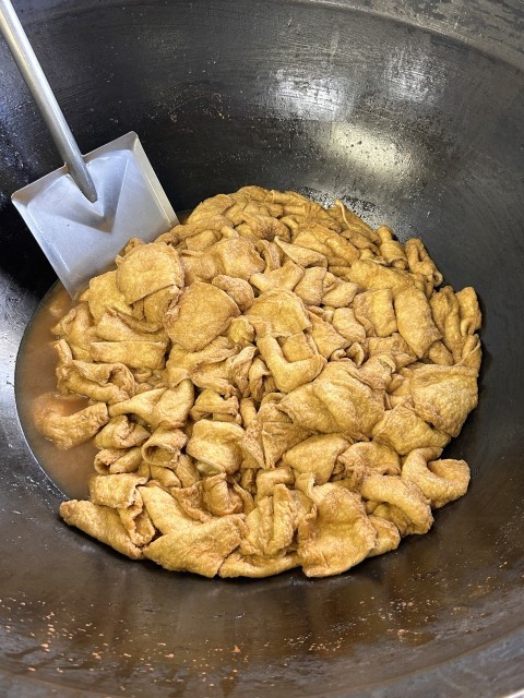 油揚げは、だし、さとう、しょうゆ、さけでじっくり煮込んでいるので、しっかり味がしみこんでいておいしいです。