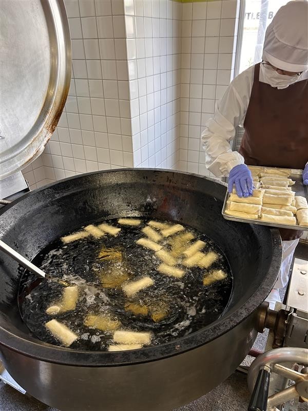 副菜は、パリパリの皮がおいしい春巻きです!しょうが、長ねぎ、豚肉、にんじん、もやし、たけのこ、はるさめなど、全部で7種類の具材を、調理員さんたちがひとつひとつ上手に包んで、揚げてくれています。春巻きはボリューム満点だったので、みなさん大きく口をあけながら頑張って食べてくれました😊