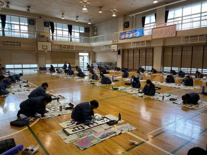 冬休み前、冬休みと練習を経て、本日席書会を行いました。3年生にとっては初めての席書会でした。はじめに比べると、準備や後片付けがスムーズになりました。そして、だるま筆を使って大きく伸び伸びと「お正月」という文字が書けました。保護者の皆様には、鑑賞をぜひ楽しみにしていただけたらと思います。