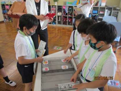 外国語を学習しました。お買い物ゲームでは、「apple please」などを用いて自分が選んだフルーツを買うことができました。