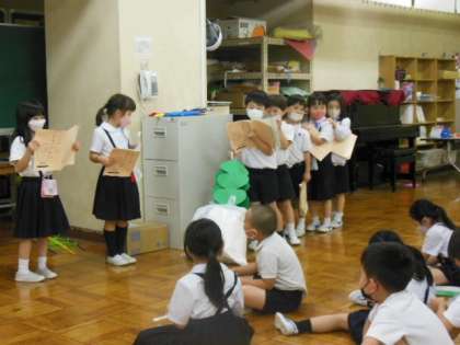 国語の単元「おおきなかぶ」で劇を行いました。グループごとに役割を決め、自分たちで台詞を考えることから学習を始め、練習を繰り返しました。本番はそれぞれのグループによって違いが出た楽しい劇となりました。校長先生や副校長先生も見に来てくださり、授業が終わるとほとんどの児童が「楽しかった。」と振り返りました。