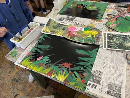 5年生の授業の様子です。図工は「ジャングル探検」です。黒いツヤツヤの紙にアクリル絵の具を使ってジャングルの様子を表現しています。どの色にも必ず白を混ぜることで色鮮やかになっています。来週の仕上がりが楽しみです。左の写真は大木先生が描いたお手本です。