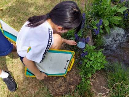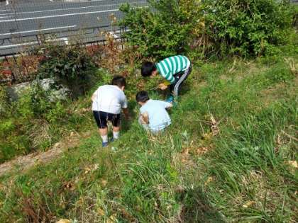 「こっちに大きいアリがいるよ!」「先生!幼虫を見付けました!」「ダンゴムシが丸まってる!」「アゲハ蝶が飛んでるよ!」と生き物に目を向ける子や、「虫めがねでよくみると、葉っぱに白い小さな毛がたくさんついてた!」「お花の形も一つ一つ違うんだ!」と植物に目を向ける子もいました。積極的に友達と対話をしながら学習問題を解決していく姿が見られました。
