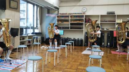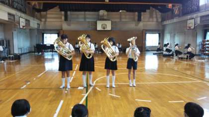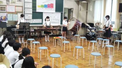 新入部員体験入部での楽器紹介。ユーフォニウム、チューバ、パーカッションの様子です。