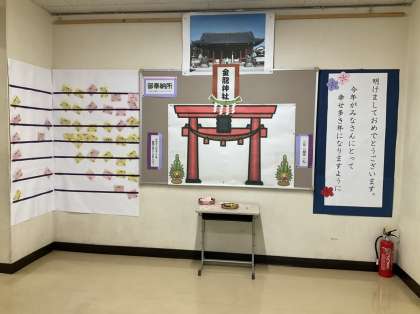 さて、今年は新型コロナウイルスの影響によって初詣に行けていない児童もいるのではないでしょうか。実は、西階段を4階まで登ると、今だけ限定の「金竜神社」が待っています。4年生の先生方が作成してくださいました。