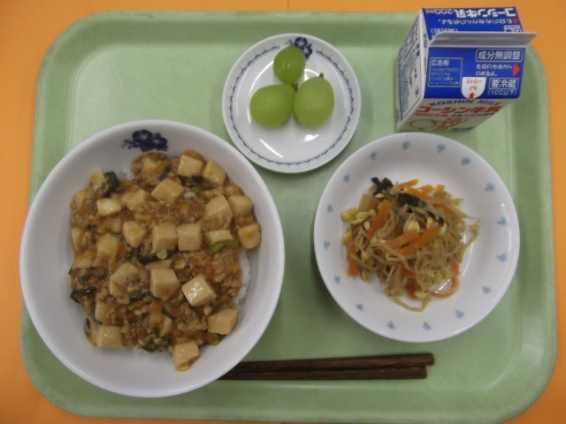 麻婆豆腐丼 もやしのナムル シャインマスカット 牛乳