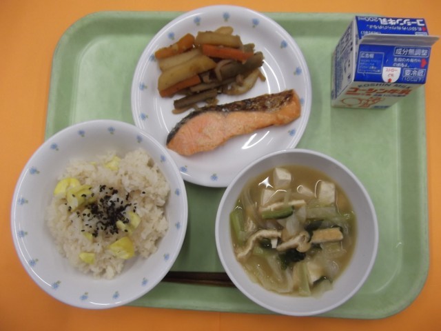 栗ご飯 魚の塩こうじ焼き 芋入り金平 みそ汁 牛乳