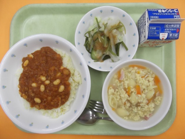 チリコンカンライス 茎わかめサラダ ふわふわ卵スープ 牛乳