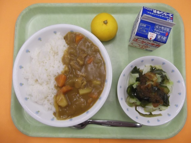 チキンカレーライス 海藻サラダ みかん 牛乳