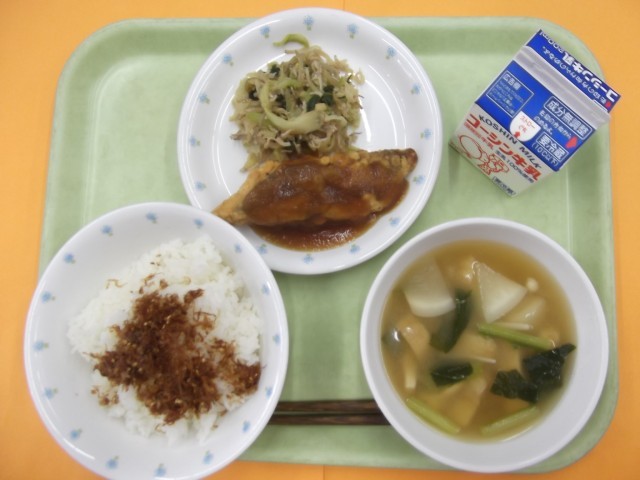 ごはん かつおでんぶ さかなのみぞれがけ しらす入り煮びたし みそ汁 牛乳