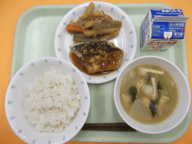 ごはん さばのごまだれ揚げ 芋入り金平 みそ汁 牛乳