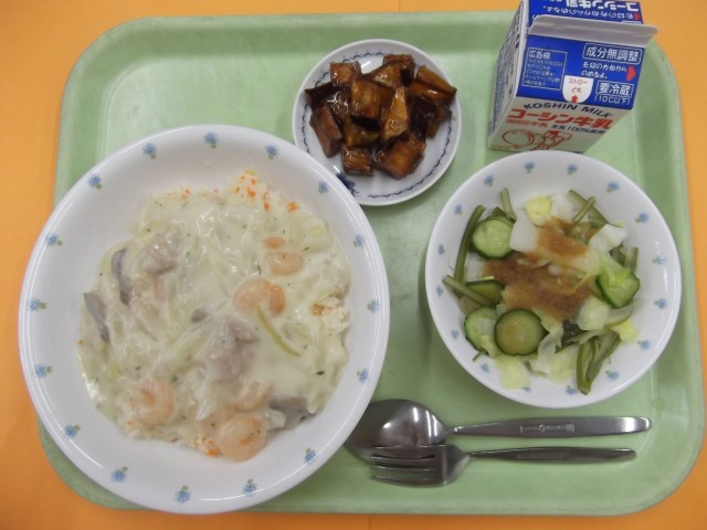 えびクリームライス 茎わかめサラダ キャラメルポテト 牛乳