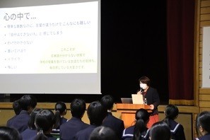 11月29日、道徳授業地区公開講座が行われました。2校時では、多文化共生 地域日本語教育コーディネーターの山藤弘子先生、ズン先生をお迎えして講演会が行われました。ミャンマー語による数学の授業では、はじめて聴く言語での授業体験や、異文化をもつ外国籍の方々への「易しい=優しい」日本語での伝え方など、楽しく充実した講演会となりました。