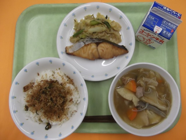 ご飯 小松菜のふりかけ 鰆の生姜焼き 辛子煮びたし せんべい汁 牛乳
