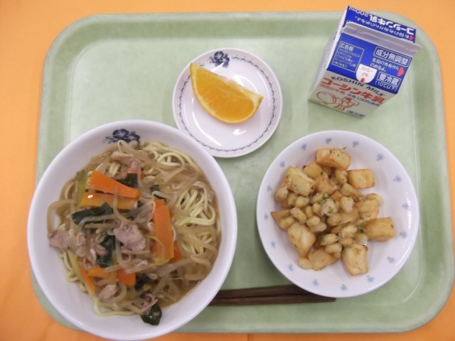 醤油ラーメン 青のりポテトビーンズ オレンジ 牛乳