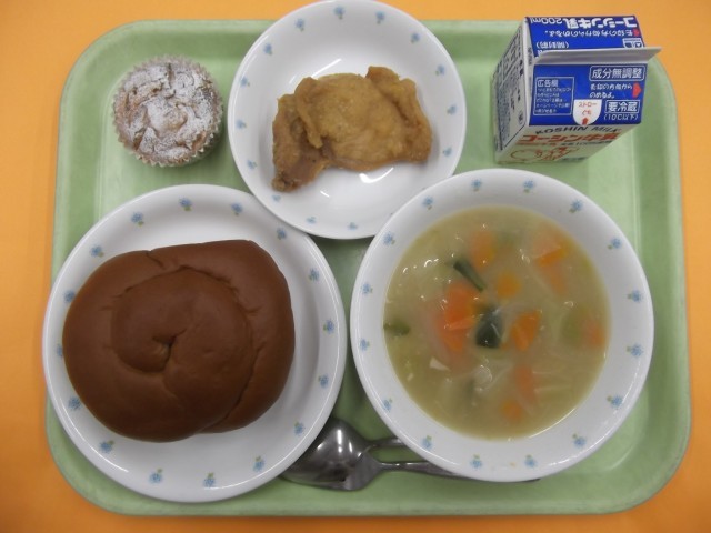 ココアパン フライドチキン パスタスープ アップルチーズケーキ 牛乳