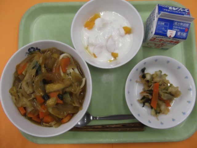 カレーうどん おろし煮びたし フルーツヨーグルト 牛乳