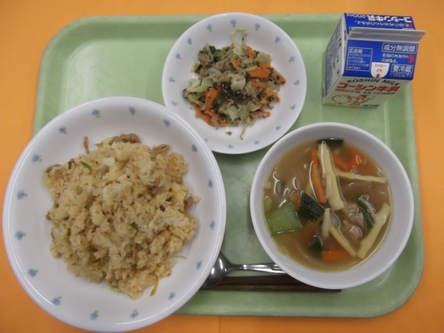 キムチチャーハン 五目スープ わかめとツナのナムル 牛乳