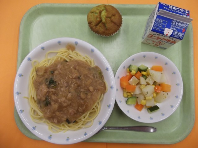 おろしスパゲッティ バジルドレサラダ 小松菜のカップケーキ 牛乳