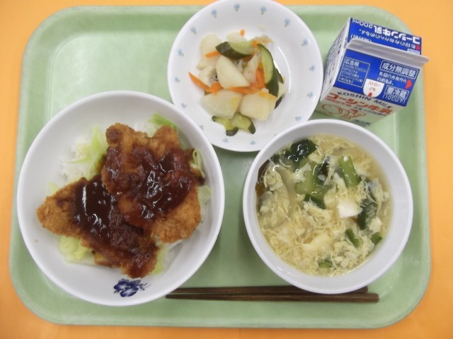 ソースカツ丼 柚子の香り漬け かきたまみそ汁 牛乳
