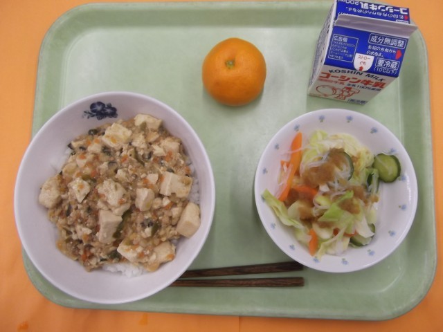 麻婆丼 中華サラダ みかん 牛乳