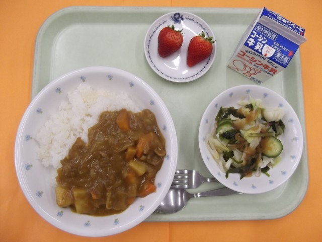 ポークカレーライス 海藻サラダ いちご 牛乳