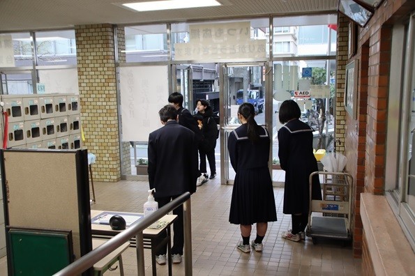 今週は挨拶強化週間です。生徒会が中心となって企画した取組で、生徒会役員が朝の玄関に立ち、登校してくる生徒に元気な挨拶を届けています。朝から明るい声が響き、学校全体がさわやかな雰囲気に包まれています。挨拶を交わすことで自然と笑顔が広がり、一日の良いスタートにつながっています。この取組は、今後も「いつでも・どこでも・何度でも」をスローガンに、みんなで明るい学校をつくっていきたいという思いが込められています。今回の取組をきっかけに、挨拶の輪がさらに広がっていくことを願っています。