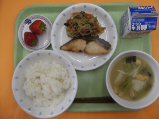 ごはん さわらの照り焼き 生姜醤油和え みそ汁 いちご 牛乳
