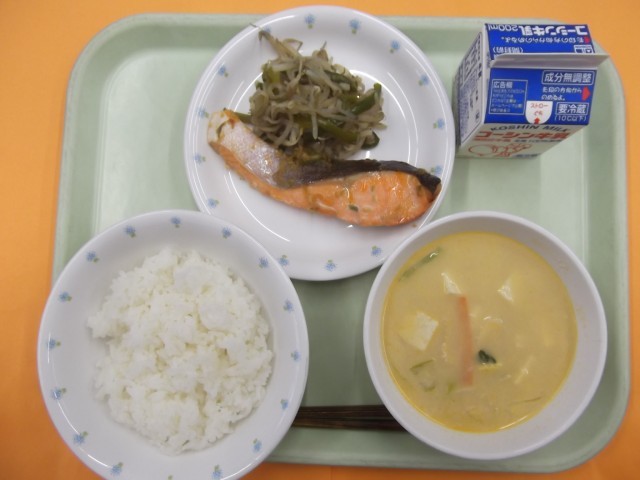 ご飯 鮭の香味焼き もやしのピリピリソテー 坦々スープ 牛乳